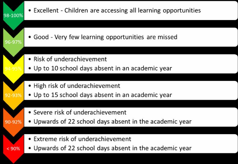 At our school, we believe that regular school attendance is essential if children are to achieve their full potential. Missing out on lessons leaves children vulnerable to falling behind and can put them at risk of wider harm. Research commissioned by the Department for Education shows missing school for even a day can mean a child is less likely to achieve good grades, which can have a damaging effect on their life chances.
